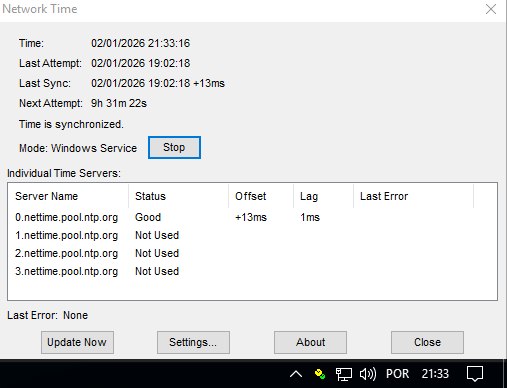 Sincronização Precisa (Segundos/Milissegundos): O NetTime ajusta o relógio do Windows automaticamente via internet, garantindo que o seu relógio local corresponda ao horário oficial usado pelas bolsas de valores.